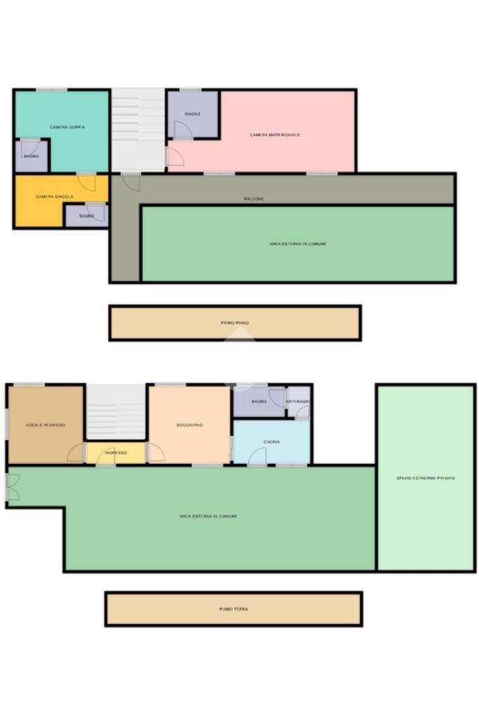 Al piano terra troviamo l'ampio e luminoso soggiorno separato dalla cucina abitabile ed il bagno di servizio finestrato con doccia. La zona giorno è completata da un comodo locale pluriuso.
